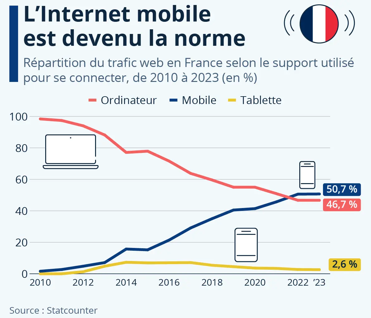 Google privilégie déjà l’indexation mobile-first, ce qui veut dire que les sites et contenus adaptés aux smartphones sont mieux référencés. Mais une app ajoute une autre dimension : elle peut être optimisée pour l’App Store Optimization (ASO), donnant une visibilité dans les stores (App Store et Google Play) en plus des résultats classiques des moteurs de recherche. Rien qu'en 2023, le mobile occupait 50% du traffic sur internet. Une hausse fulgurante depuis 2010.
